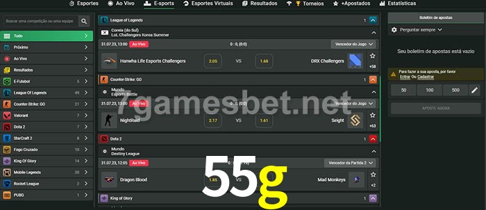 O 55g oferece uma grande seleção de opções de apostas em e-sports com probabilidades competitivas